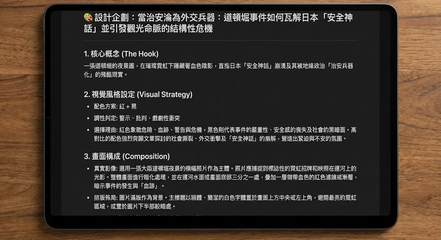 對台灣讀者而言,這種類似「隨機殺人」或「社會邊緣人反撲」的恐懼並不陌生。但在日本的脈絡下,這更意味著一種「社會防禦機制」的失靈。當象徵繁榮與秩序的道頓堀血跡斑斑,日本所販售的「安全」這一無形資產,正在全球旅遊市場中迅速貶值。